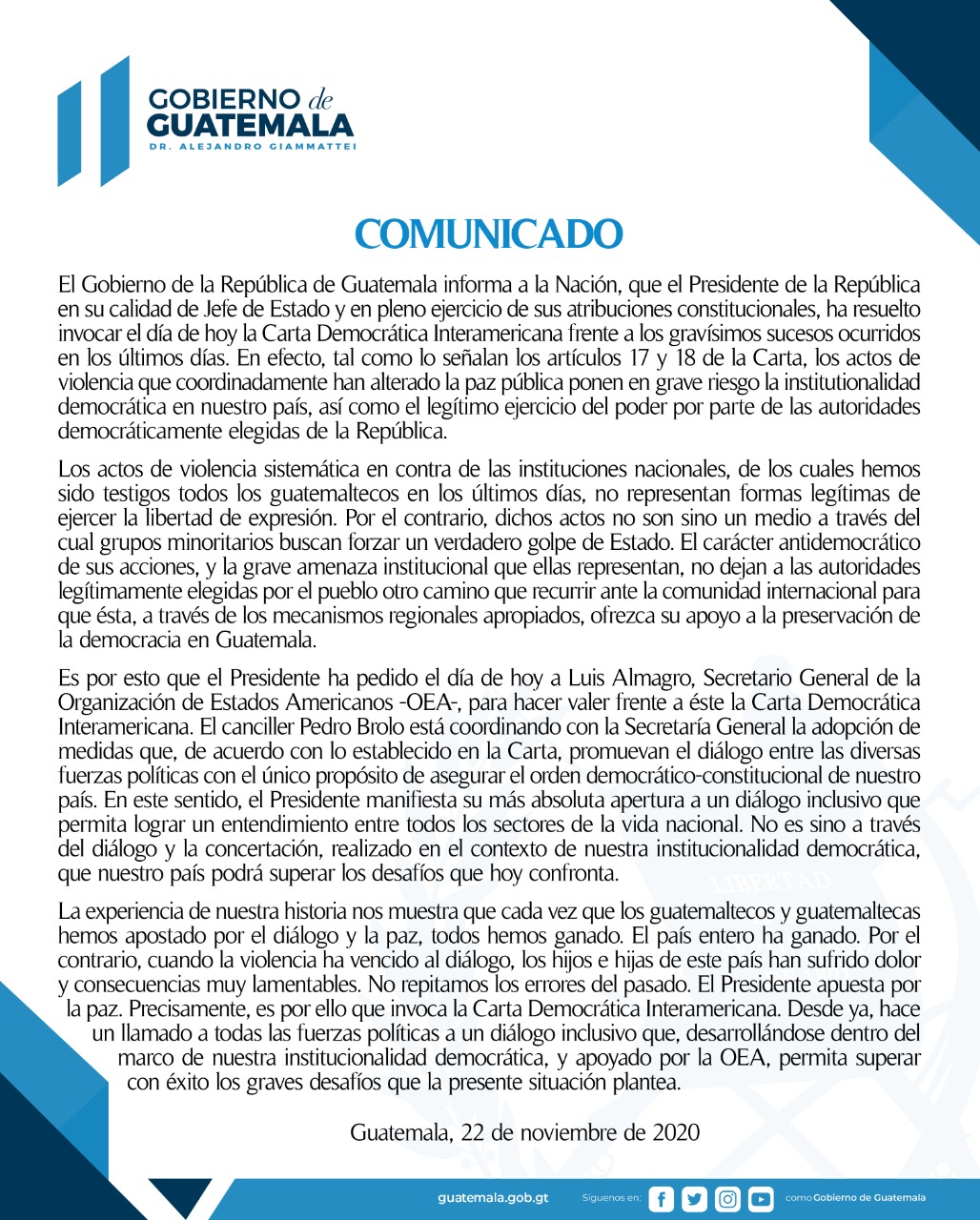 A través de un comunicado en las redes sociales, el Gobierno de Guatemala confirmó que recurrirá a la Carta Democrática Interamericana para poder llegar a acuerdos satisfactorios y llegar a entablar un diálogo.