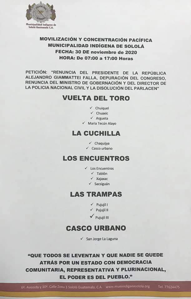 La Municipalidad Indígena de Sololá convocó a una manifestación pacífica para este lunes 30 de noviembre, y por lo tanto, varios puntos quedarán cerrados.