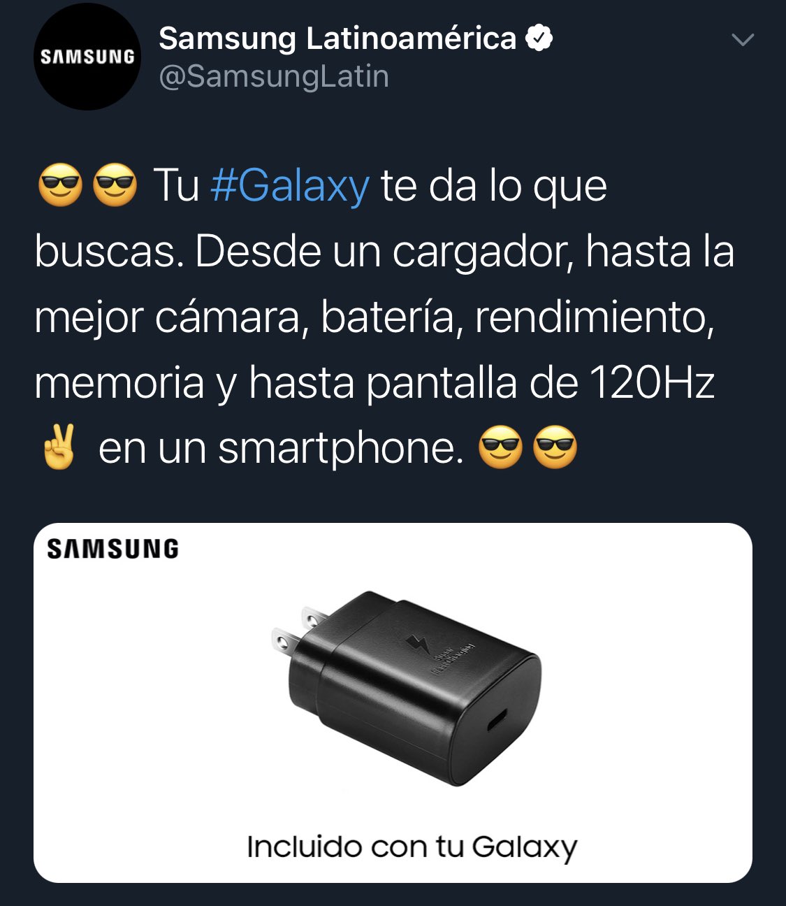 Mientras que Samsung expresó: «Tu #Galaxy te da lo que buscas. Desde un cargador, hasta la mejor cámara, batería, rendimiento, memoria y hasta pantalla de 120HZ en un smartphone».